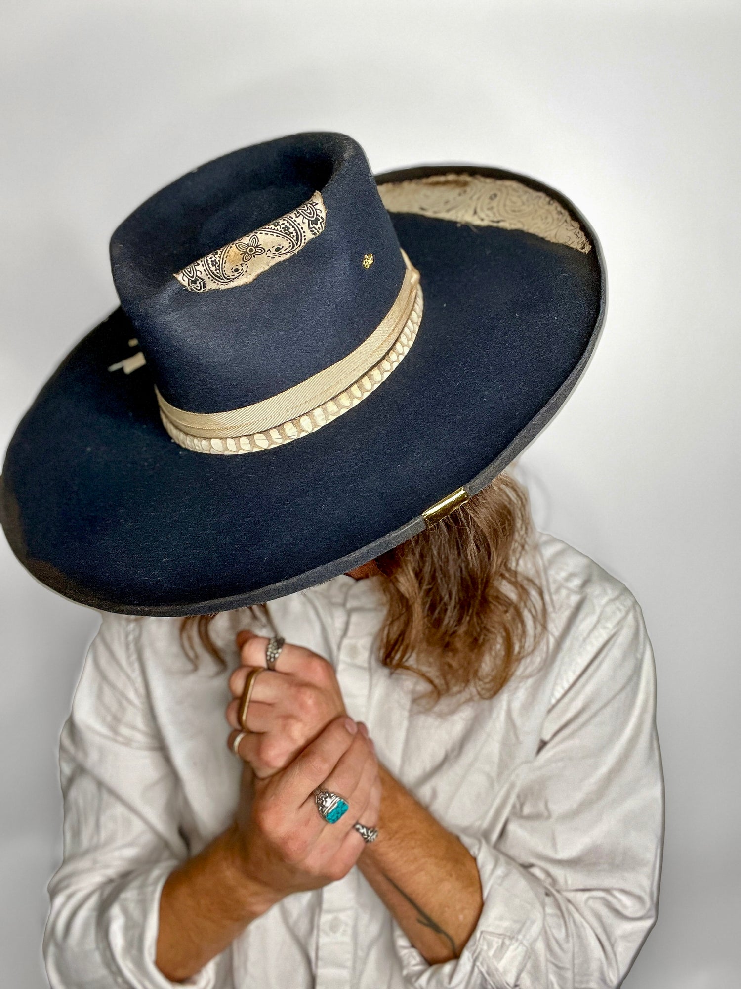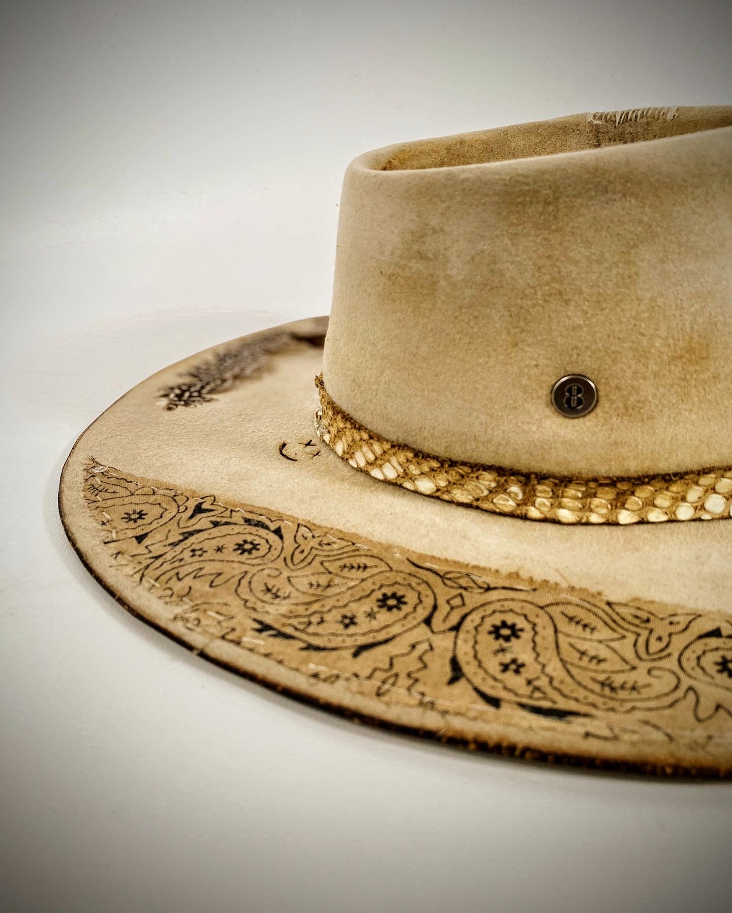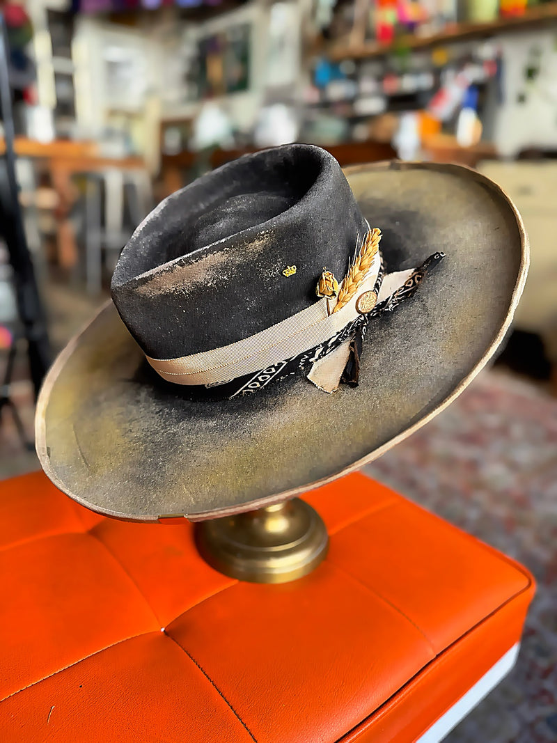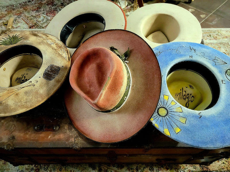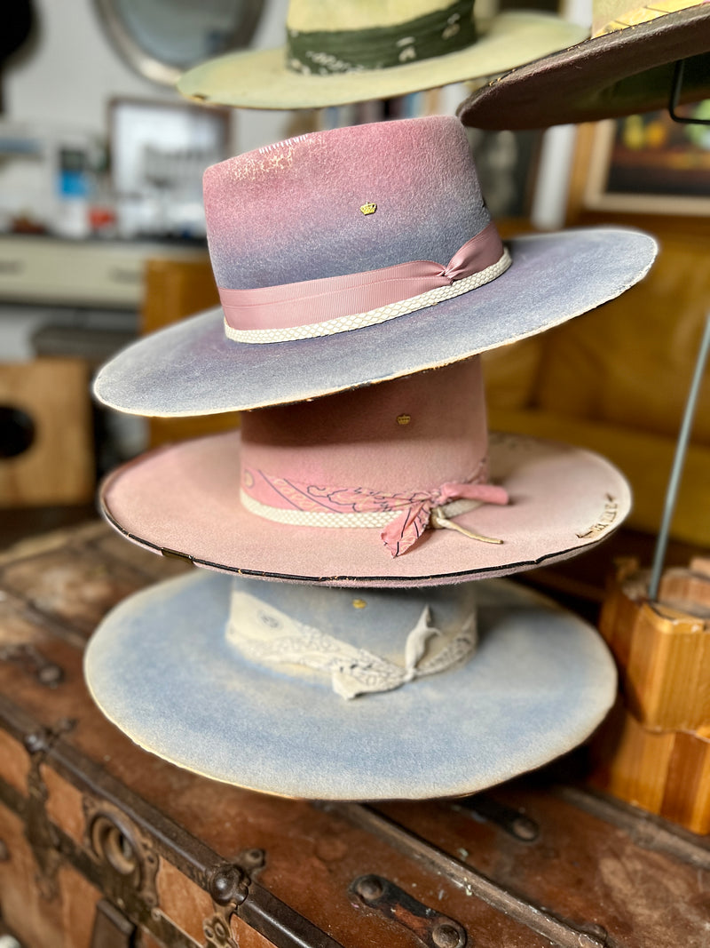 Every custom hat is shaped through a process combining traditional millinery techniques, material selection, and artistic finishing. From handcrafted fur felt hats to burned textures and bespoke detailing, each piece reflects the balance between craftsmanship and personal expression.